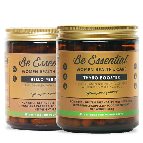 Explora la familia "Recupera tu Ciclo y Potencia Tu Tiroides" de Be Essential, donde se combinan los beneficios de Hello Period para el equilibrio hormonal y la regularidad del ciclo menstrual con Thyrobooster, que contribuye al funcionamiento óptimo de la glándula tiroides.